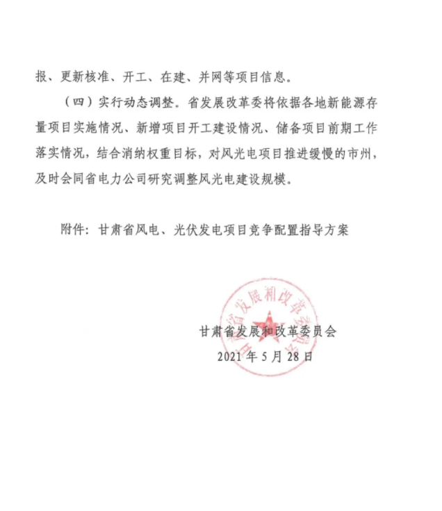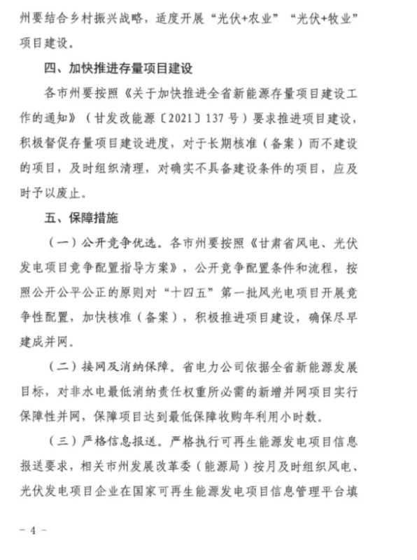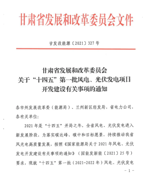 中國儲能網(wǎng)訊:5月28日,甘肅發(fā)改委正式下發(fā)《關(guān)于“十四五”第一批風(fēng)電、光伏發(fā)電項目開發(fā)建設(shè)有關(guān)事項的通知》。明確2021-2022年甘肅省安排新增風(fēng)電、光伏發(fā)電項目建設(shè)規(guī)模1200萬千瓦。