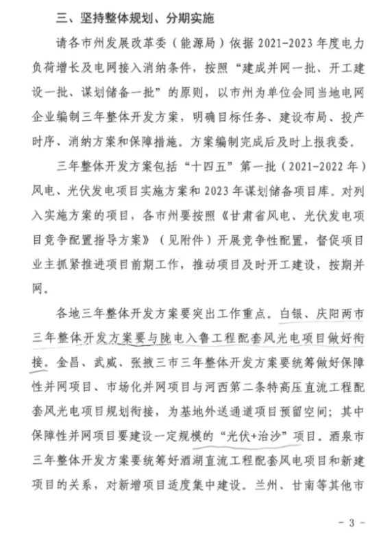 要求白銀、慶陽兩市三年整體開發(fā)方案要與隴電入魯工程配套風(fēng)光電項目做好銜接。金昌、武威、張掖三市三年整體開發(fā)方案要統(tǒng)籌做好保障性并網(wǎng)項目、市場化并網(wǎng)項目與河西第二條特高壓直流工程配套風(fēng)光電項目規(guī)劃銜接,為基地外送通道項目預(yù)留空間;其中保障性并網(wǎng)項目要建設(shè)一定規(guī)模的“光伏+治沙”項目。酒泉市三年整體開發(fā)方案要統(tǒng)籌好酒湖直流工程配套風(fēng)電項目和新建項目的關(guān)系,對新增項目適度集中建設(shè)。蘭州、甘南等其他市州要結(jié)合鄉(xiāng)村振興戰(zhàn)略,適度開展“光伏+農(nóng)業(yè)”“光伏+牧業(yè)”項目建設(shè)。