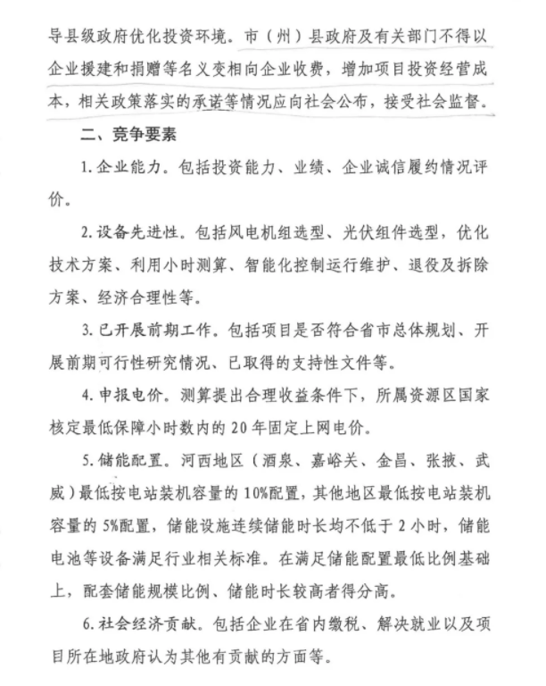 此外,競爭確定電價。參與競爭配置的風(fēng)電、光伏發(fā)電項目通過競爭方式配置并確定上網(wǎng)電價,各項目申報的上網(wǎng)電價不得高于國家規(guī)定的同類資源區(qū)指導(dǎo)價,同時不得設(shè)置競爭最低限價。