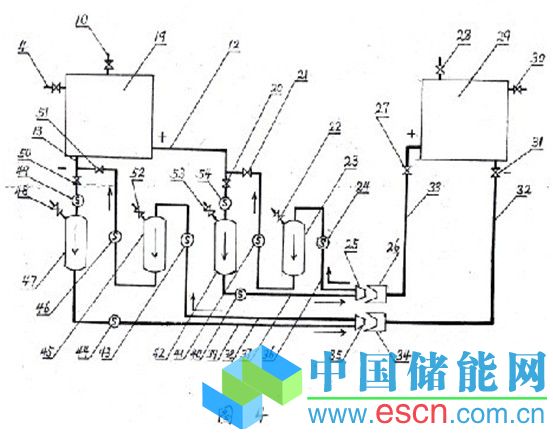 上述連接系統(tǒng)通過微電腦的程序化控制,可先將被換液電池體(29)里放電后的正、負(fù)無電電液通過b泵體(24)和f泵體(43)抽出暫存在a儲液罐(23)和c儲液罐(45)中,此時在被換液電池體正極電液管(33)上的電池閥(27)和負(fù)極電液管(32)上的電池閥(31)是打開的,還有電池體上的出氣閥(28)和(30)也是打開的;然后再將b儲液罐(42)和d儲液罐(47)中充好電的有電電液通過d泵體(40)h和泵體(44)加注到被換液電池體中,最后再將暫存在a儲液罐(23)和c儲液罐(45)中的正、負(fù)無電電液通過a泵體(21)和e泵體(51)分別回送到充電電池體(19)中進(jìn)行再一次的充電過程(該裝置讓充電的時間得到重新分配,使客戶的長時充電時間轉(zhuǎn)移給了專業(yè)的充電站完成,從而解決了電動汽車充電速度慢的技術(shù)瓶頸)。該電池漿液可循環(huán)使用,節(jié)約資源,綠色環(huán)保,如同加油,方便快捷,開啟了汽車的“電油”時代!