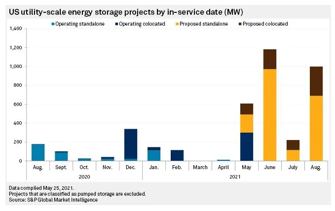 S&P Global Market Intelligence的數(shù)據(jù)顯示,如果開發(fā)商和公用事業(yè)公司的計劃獲得成功,截至今年8月份,美國公用事業(yè)規(guī)模的儲能總裝機(jī)容量(不包括常規(guī)抽水蓄能電站)同比增長185%,至5582MW。