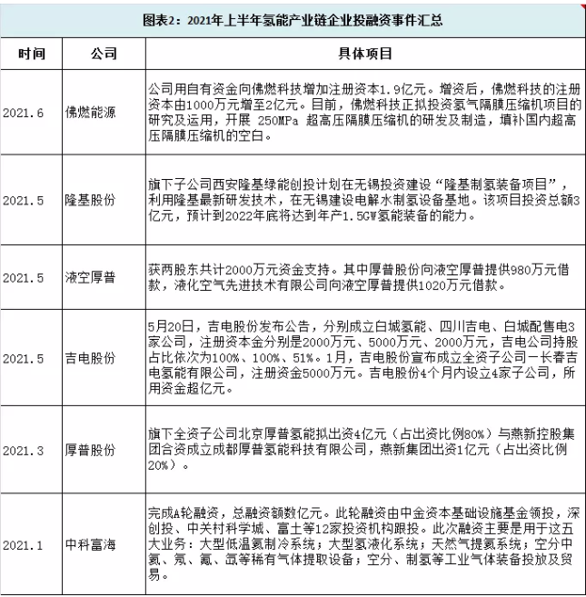 同時(shí)也有多家央企、跨國(guó)企業(yè)、光伏巨頭公開宣布入局氫能行業(yè),比如中國(guó)能建、隆基股份等。未來(lái),隨著氫能行業(yè)成為低碳清潔能源賽道里的一個(gè)主要細(xì)分賽道,業(yè)界推測(cè)針對(duì)這一行業(yè)的投融資有望越來(lái)越活躍。