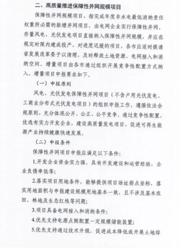 在保障性項目申報方面,資金實力強(qiáng)、負(fù)債率低的企業(yè)優(yōu)先;需落實項目用地,提供拐點坐標(biāo)且項目規(guī)模與用地面積相匹配;支持電源點配置儲能的項目優(yōu)先;優(yōu)先通過以技術(shù)降低土地成本或提高土地利用率的示范項目。