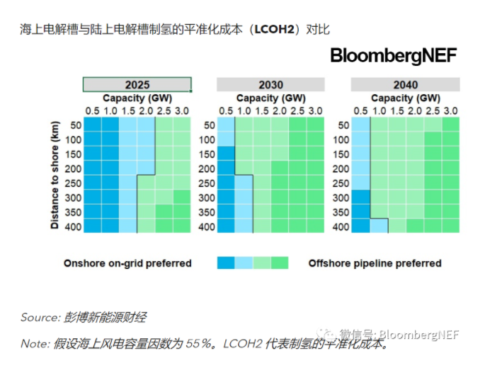 海上電解槽制氫項目的成本通常高于陸上電解槽制氫,但將在2030年迎來拐點。對于離岸距離較遠的GW級大型項目,直接在海上部署電解槽制氫并通過海底管道將生產(chǎn)的氫氣輸送回陸地是更合適的選擇。