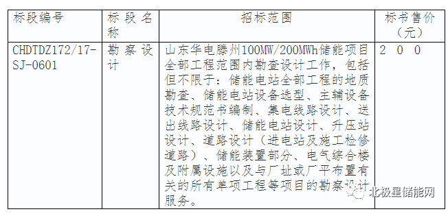 山東華電滕州100MW/200MWh儲(chǔ)能項(xiàng)目全部工程范圍內(nèi)勘查設(shè)計(jì)工作,包括但不限于:儲(chǔ)能電站全部工程的地質(zhì)勘查、儲(chǔ)能電站設(shè)備選型、主輔設(shè)備技術(shù)規(guī)范書編制、集電線路設(shè)計(jì)、送出線路設(shè)計(jì)、儲(chǔ)能電站設(shè)計(jì)、升壓站設(shè)計(jì)、道路設(shè)計(jì)(進(jìn)電站及施工檢修道路)、儲(chǔ)能裝置部分、電氣綜合樓及附屬設(shè)施以及與廠址或廠平布置有關(guān)的所有單項(xiàng)工程等項(xiàng)目的勘察設(shè)計(jì)服務(wù)。