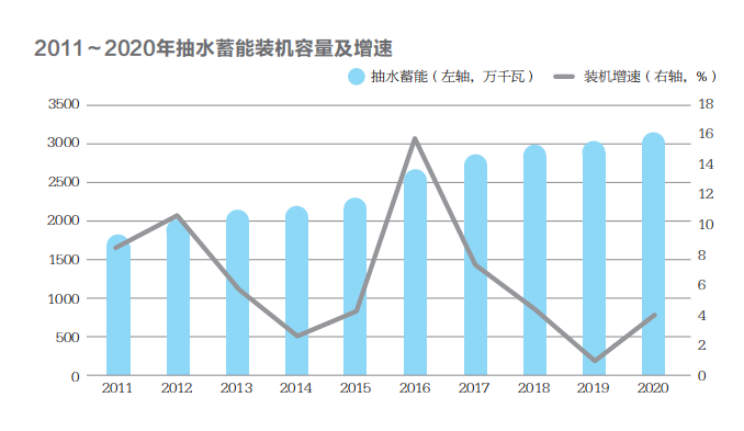 2015年,國家能源局發(fā)布的《關(guān)于鼓勵社會資本投資水電站的指導(dǎo)意見》提出,社會資本可通過市場方式選擇未明確開發(fā)主體的抽水蓄能電站。這一政策與國家發(fā)改委《關(guān)于完善抽水蓄能電站價格形成機(jī)制有關(guān)問題的通知》提出的“在電力市場形成前,抽水蓄能實(shí)施兩部制電價”意見,共同推動了發(fā)電企業(yè)投資抽水蓄能電站的熱情,使投資明顯回暖,但由于容量電價無法正常疏導(dǎo)和回收,抽水蓄能裝機(jī)增速在“十三五”期間仍一路走低。