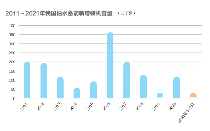 2020年年初,新冠肺炎疫情突如其來。當(dāng)年1月,國家發(fā)改委、國家能源局召開應(yīng)對疫情能源供應(yīng)保障電視電話會議,重點(diǎn)強(qiáng)調(diào)了能源保供部署安排,加快推動重大項(xiàng)目、重大工程建設(shè),發(fā)揮好能源行業(yè)在“六穩(wěn)”工作中的重要作用。為助推企業(yè)復(fù)工復(fù)產(chǎn),國家電網(wǎng)決定重啟抽水蓄能建設(shè)。當(dāng)年2月7日,國家電網(wǎng)有限公司進(jìn)一步研究出臺了應(yīng)對疫情影響,全力恢復(fù)建設(shè),助推企業(yè)復(fù)工復(fù)產(chǎn)的12項(xiàng)舉措,明確開工山西垣曲抽水蓄能電站等一批工程,抽水蓄能正式重啟。2020年12月,國家電網(wǎng)有限公司宣布,山西渾源、浙江磐安、山東泰安二期抽水蓄能電站項(xiàng)目集中開工。2021年1~2月,新增抽水蓄能裝機(jī)容量30萬千瓦,相當(dāng)于2019年全年的新增規(guī)模。
