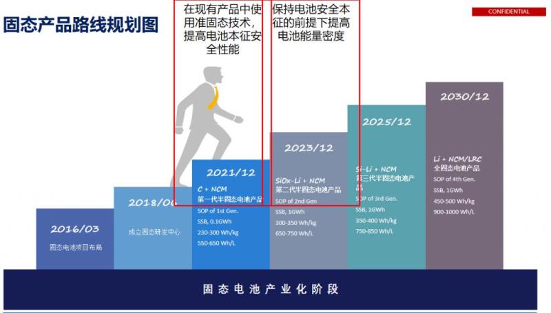 根據(jù)蜂巢無錫 118 創(chuàng)新中心展示的宣傳圖片,他們的計(jì)劃是 2021 年底產(chǎn)出第一代、復(fù)合電解質(zhì)固態(tài)電池,能量密度在 250-300wh/kg,2030 年底做出第四代、全固態(tài)電解質(zhì)的電池,能量密度在 450-500wh/kg。