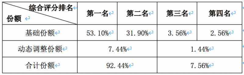 中標(biāo)人數(shù)量原則上為4個(gè),由綜合評(píng)分排名前4的中標(biāo)候選人中標(biāo),中標(biāo)份額占比為數(shù)量份額占比,具體份額分配方案為:
