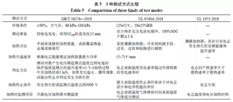 所以,儲能電池需要進行電池?zé)崾Э販y試,目前,儲能用電池?zé)崾Э匾蠛蜏y試方法的相關(guān)標(biāo)準(zhǔn)有GB/T 36276—2018,UL9540A:2018,UL1973:2018,各標(biāo)準(zhǔn)應(yīng)用場景大體相同,但測試存在差異性,如表5所示。