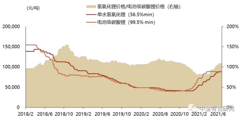 三是氫氧化鋰相對碳酸鋰溢價處于低位,結(jié)構(gòu)性緊缺下氫氧化鋰價格有望進(jìn)入上行通道。截至2021年6月25日,氫氧化鋰價格/電碳價格(折碳酸鋰當(dāng)量)僅109%,處于歷史低位,考慮到氫氧化鋰具備更高的工藝壁壘及產(chǎn)品質(zhì)量要求,電池級氫氧化鋰相對電池級碳酸鋰應(yīng)存在一定溢價空間。我們預(yù)計未來氫氧化鋰供給或?qū)㈦y以匹配海外需求增長,結(jié)構(gòu)性緊缺有望驅(qū)動氫氧化鋰加速上漲。