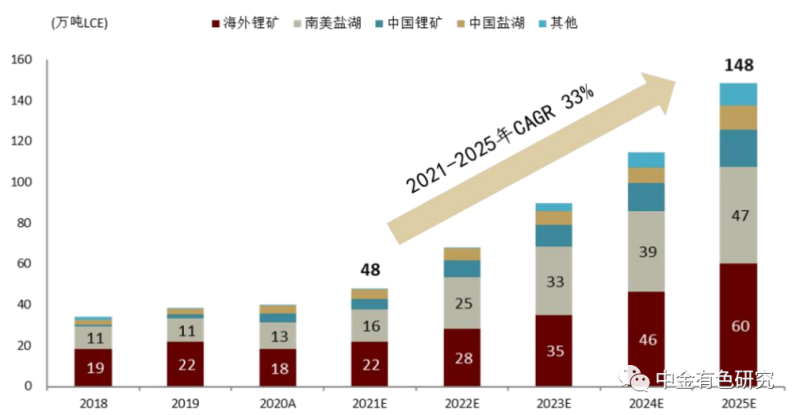 國內(nèi)鋰資源開發(fā)有望加速。國內(nèi)鋰資源雖儲量豐厚,但其資源稟賦并不出色,且受當(dāng)?shù)囟喾N因素制約,長期以來開發(fā)程度較低,僅作為供給側(cè)補(bǔ)充。在上輪鋰價下行期,國內(nèi)鋰礦及鹽湖產(chǎn)能逆周期擴(kuò)張,且生產(chǎn)工藝持續(xù)進(jìn)化,當(dāng)前國內(nèi)鋰資源保障已經(jīng)提升到戰(zhàn)略高度,國內(nèi)優(yōu)質(zhì)鋰礦以及鹽湖資源的開發(fā)進(jìn)程有望加速,我們預(yù)計國內(nèi)鋰資源供給將從2021年的10.0萬噸LCE增長至2025年的29.8萬噸LCE,2021-2025年CAGR為31%。