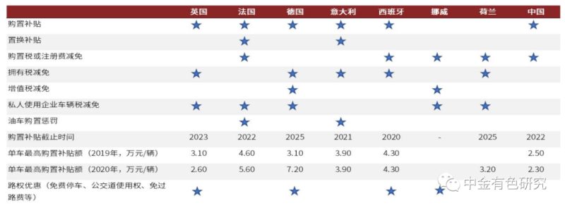 歐洲各國以高補(bǔ)貼政策刺激新能源汽車消費。歐洲各國對新能源汽車實施稅收減免等補(bǔ)貼以刺激新能源汽車消費,具體在購置補(bǔ)貼、登記稅、所有稅和公司用車稅上均有減免政策。在歐盟碳排放標(biāo)準(zhǔn)日益趨嚴(yán)的壓力下,各國或因難以達(dá)到補(bǔ)貼標(biāo)準(zhǔn)而延遲補(bǔ)貼退出,甚至進(jìn)一步增加補(bǔ)貼力度。以德國為例,2020年10月德國新車排放量為131.4g/km,距離歐盟95g/km的標(biāo)準(zhǔn)有一定差距,因此政府將撥款10億元,并將購買新能源汽車的消費者的補(bǔ)貼延長到2025年。