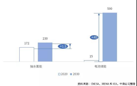 圖 2 2020-2030年全球抽水蓄能和電池儲(chǔ)能累計(jì)裝機(jī)規(guī)模(單位:GW)