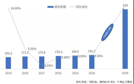圖 1 2015-2020年全球儲(chǔ)能市場(chǎng)累計(jì)裝機(jī)規(guī)模(單位:GW)