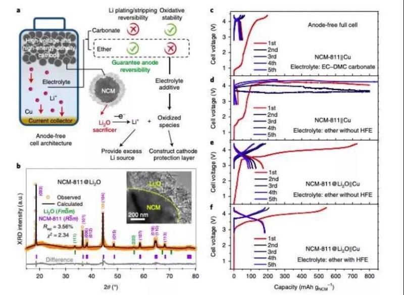 研究人員表示:“實(shí)現(xiàn)高鋰可逆性具有挑戰(zhàn)性,尤其是考慮到電芯配置中有限的鋰儲(chǔ)存(通常為零鋰過(guò)量)。在這項(xiàng)研究中,我們?cè)贚iNi0.8Co0.1Mn0.1O2正極上引入 Li 2 O ,作為預(yù)加載犧牲劑,以提供額外的鋰源。在長(zhǎng)期循環(huán)過(guò)程中,這可以抵消鋰在初始無(wú)負(fù)極電芯中的不可逆損耗?!?