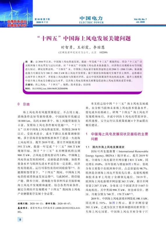 時(shí)智勇, 王彩霞, 李瓊慧. “十四五”中國(guó)海上風(fēng)電發(fā)展關(guān)鍵問(wèn)題[J]. 中國(guó)電力, 2020, 53(7): 8-17.