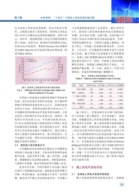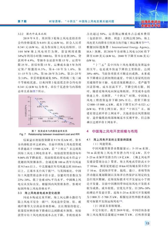 結(jié)論:本文結(jié)合“十三五”以及歐洲海上風(fēng)電開發(fā)與運(yùn)行經(jīng)驗(yàn),對(duì)“十四五”中國(guó)海上風(fēng)電技術(shù)裝備能力、經(jīng)濟(jì)性以及開發(fā)布局等問(wèn)題進(jìn)行探討。結(jié)果顯示,機(jī)組單機(jī)功率、離岸距離與水深、建安施工裝備與施工效率是衡量海上風(fēng)電技術(shù)的重要標(biāo)志。中國(guó)與歐洲海上風(fēng)電主要國(guó)家還存在一定差距,裝備制造能力可滿足每年300萬(wàn)~500萬(wàn)kW海上風(fēng)電開發(fā)需要;度電成本難以媲美歐洲主要國(guó)家,沿海各省雖然資源成本有所差異,但開發(fā)效益趨于一致,“十四五”末,福建有望達(dá)到平價(jià)上網(wǎng)水平,其他省份在風(fēng)資源較好、造價(jià)偏低的局部海域可實(shí)現(xiàn)平價(jià),但難以達(dá)到總體平價(jià)上網(wǎng)水平;受資源與省級(jí)規(guī)劃、供應(yīng)鏈產(chǎn)能、施工與吊裝能力、消納能力等約束,“十四五”末,中國(guó)海上風(fēng)電累計(jì)裝機(jī)容量將達(dá)到2500 ~ 3500萬(wàn)kW。最后本文結(jié)合中國(guó)海上風(fēng)電發(fā)展基本情況,分別從資源評(píng)估、機(jī)組選型、安全運(yùn)行以及政策機(jī)制4個(gè)方面提出“十四五”期間促進(jìn)海上風(fēng)電平穩(wěn)有序發(fā)展的基本舉措。