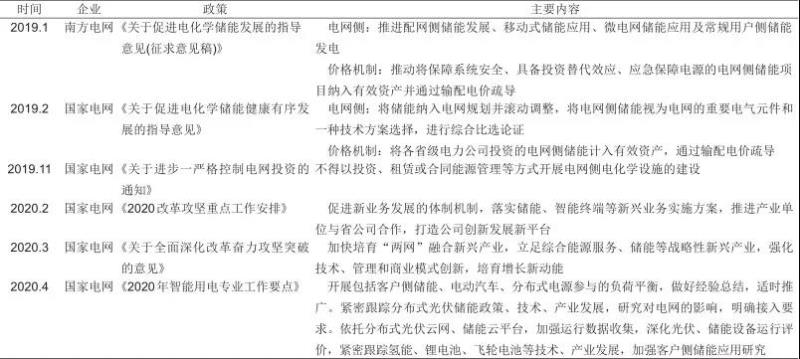 儲(chǔ)能作為能源結(jié)構(gòu)重要的支撐技術(shù),近年來(lái),在儲(chǔ)能核心技術(shù)不斷突破、儲(chǔ)能產(chǎn)業(yè)快速發(fā)展和社會(huì)認(rèn)知度不斷提升的同時(shí),電力企業(yè)也越來(lái)越重視儲(chǔ)能的發(fā)展[21]。2019年南方電網(wǎng)和國(guó)家電網(wǎng)印發(fā)了《關(guān)于促進(jìn)電化學(xué)儲(chǔ)能發(fā)展的指導(dǎo)意見(jiàn)(征求意見(jiàn)稿)》和《關(guān)于促進(jìn)電化學(xué)儲(chǔ)能健康有序發(fā)展的指導(dǎo)意見(jiàn)》,內(nèi)容主要圍繞電網(wǎng)側(cè)儲(chǔ)能發(fā)展和通過(guò)輸配電價(jià)疏導(dǎo)電網(wǎng)側(cè)儲(chǔ)能項(xiàng)目資產(chǎn)兩方面。2019年5月,國(guó)家發(fā)改委印發(fā)了《輸配電定價(jià)成本監(jiān)審辦法》,明確電儲(chǔ)能設(shè)施不得計(jì)入輸配電價(jià),意味著在儲(chǔ)能降本難度大、產(chǎn)業(yè)發(fā)展不成熟、盈利模式不清晰的階段,輸配電價(jià)不能成為電網(wǎng)側(cè)儲(chǔ)能新的可行商業(yè)模式。同年11月,國(guó)家電網(wǎng)公司發(fā)布了《關(guān)于進(jìn)步一嚴(yán)格控制電網(wǎng)投資的通知》,規(guī)定不得以投資、租賃或合同能源管理等方式開(kāi)展電網(wǎng)側(cè)電化學(xué)設(shè)施的建設(shè)。因此之后國(guó)家電網(wǎng)的政策主要集中在發(fā)展儲(chǔ)能的關(guān)鍵技術(shù)和重點(diǎn)領(lǐng)域,并首次明確了國(guó)網(wǎng)公司發(fā)展的儲(chǔ)能政策機(jī)制方向,具體信息匯總?cè)绫?所示。