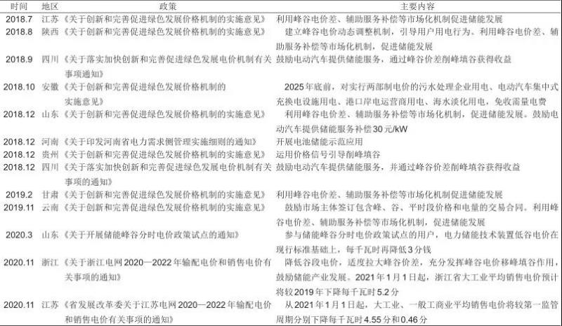 全國(guó)各地峰谷價(jià)差的合理調(diào)整對(duì)儲(chǔ)能技術(shù)應(yīng)用特別是用戶側(cè)儲(chǔ)能的應(yīng)用支持顯著,加大峰谷電價(jià)的實(shí)施力度,引導(dǎo)用戶錯(cuò)峰用電,使儲(chǔ)能的應(yīng)用價(jià)值得以合理的核算,可提高項(xiàng)目的收益水平,并對(duì)提高電力資源的利用效率有積極的作用。目前在各省市下調(diào)工商業(yè)銷(xiāo)售電價(jià)后,北京、江蘇、廣東、浙江、安徽、云南、上海等地的一般工商業(yè)的峰谷價(jià)差超過(guò)0.7元/(kW·h),其中北京城區(qū)和郊區(qū)各電壓等級(jí)的峰谷價(jià)差更是高達(dá)1元/(kW·h)以上,而江蘇、廣東部分地市、浙江也普遍超過(guò)0.8元/(kW·h),為這些地區(qū)用戶側(cè)儲(chǔ)能的開(kāi)展提供了較為有利的條件。據(jù)資料分析,峰谷價(jià)差大于0.7元/(kW·h)便可以有收益。但對(duì)于未來(lái)用戶側(cè)儲(chǔ)能市場(chǎng)來(lái)說(shuō),除了政策上需要進(jìn)一步擴(kuò)大電價(jià)差之外,儲(chǔ)能的成本、壽命也直接影響國(guó)內(nèi)用戶側(cè)儲(chǔ)能的推廣。2018年7月,國(guó)家發(fā)改委印發(fā)了《關(guān)于創(chuàng)新和完善促進(jìn)綠色發(fā)展價(jià)格機(jī)制的意見(jiàn)》,明確指出加大峰谷電價(jià)實(shí)施力度,運(yùn)用價(jià)格信號(hào)引導(dǎo)電力削峰填谷,利用峰谷電價(jià)差、輔助服務(wù)補(bǔ)償?shù)仁袌?chǎng)化機(jī)制,促進(jìn)儲(chǔ)能發(fā)展。目前已有江蘇、山東、云南、貴州等地先后轉(zhuǎn)發(fā)了該文件,表示將加大峰谷電價(jià)支持力度。近年我國(guó)地方主要峰谷電價(jià)政策如表8所示。