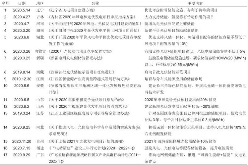 以上兩個(gè)通知的發(fā)布為我國(guó)新能源配置儲(chǔ)能的模式拉開(kāi)了帷幕,據(jù)北極星儲(chǔ)能網(wǎng)統(tǒng)計(jì),目前我國(guó)明確提出可再生能源配儲(chǔ)能要求的地區(qū)已有17個(gè),而配置的比例各不相同,其中山西省因配備儲(chǔ)能比例高而備受關(guān)注,其《關(guān)于2020年擬新建光伏發(fā)電項(xiàng)目的消納意見(jiàn)》中建議新增光伏發(fā)電項(xiàng)目應(yīng)統(tǒng)籌考慮具有一定用電負(fù)荷的全產(chǎn)業(yè)鏈項(xiàng)目,配備15%~20%的儲(chǔ)能,落實(shí)消納協(xié)議。相關(guān)政策匯總?cè)绫?所示。