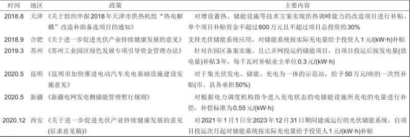 2018年8月,天津市工信委、財(cái)政局發(fā)布關(guān)于組織申報(bào)2018年天津市供熱機(jī)組“熱電解耦”改造補(bǔ)助備選項(xiàng)目的通知,為推動(dòng)“熱電解耦”改造,緩解冬季電網(wǎng)調(diào)峰,將對(duì)增設(shè)蓄熱、儲(chǔ)能設(shè)施等技術(shù)方案實(shí)現(xiàn)供熱調(diào)峰能力的改造項(xiàng)目進(jìn)行補(bǔ)貼。要求項(xiàng)目是在2014年1月1日以后實(shí)施、且已完工投入運(yùn)行,對(duì)改善電網(wǎng)調(diào)峰具有實(shí)際效果,單個(gè)項(xiàng)目補(bǔ)貼資金不超過(guò)600萬(wàn)元且不超過(guò)項(xiàng)目總投資的30%。這是我國(guó)最早對(duì)儲(chǔ)能項(xiàng)目進(jìn)行補(bǔ)貼的的地方政策,極大地激勵(lì)了地方儲(chǔ)能的發(fā)展。而后合肥、蘇州、昆明、新疆、西安等地也陸續(xù)出臺(tái)了地方補(bǔ)貼政策,其中蘇州市地方政府的補(bǔ)貼無(wú)任何對(duì)儲(chǔ)能系統(tǒng)容量、放電時(shí)長(zhǎng)的要求,補(bǔ)貼門(mén)檻較低,而江蘇是我國(guó)的工業(yè)集中地區(qū),用電峰谷價(jià)差水平居全國(guó)前列,用戶側(cè)儲(chǔ)能發(fā)展迅速。近三年來(lái)我國(guó)主要地方儲(chǔ)能補(bǔ)貼政策如表6所示。