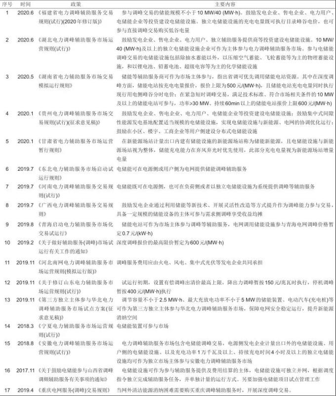 目前,儲(chǔ)能在我國(guó)電力市場(chǎng)有5個(gè)應(yīng)用領(lǐng)域:電源側(cè)、集中式可再生能源并網(wǎng)、輔助服務(wù)、電網(wǎng)側(cè)、用戶側(cè)。其中集中式可再生能源并網(wǎng)的項(xiàng)目已經(jīng)初具規(guī)模,輔助服務(wù)和電網(wǎng)側(cè)項(xiàng)目也迎來(lái)新的發(fā)展。近年國(guó)內(nèi)多個(gè)省市和地區(qū)發(fā)布了電力輔助服務(wù)建設(shè)方案和運(yùn)營(yíng)規(guī)則,這些規(guī)則進(jìn)一步促進(jìn)了電力輔助服務(wù)市場(chǎng)健康有序的發(fā)展,也為儲(chǔ)能等新技術(shù)以及新市場(chǎng)主體參與電力市場(chǎng)提供了平臺(tái)。據(jù)統(tǒng)計(jì),截止2020年8月我國(guó)已有17個(gè)省份地區(qū)發(fā)布了調(diào)峰輔助服務(wù)市場(chǎng)政策文件,分別為福建、湖北、湖南、貴州、甘肅、東北、河南、廣西、青海、江蘇、河北、山東、華北、寧夏、安徽、山西和重慶,幾乎每個(gè)地區(qū)都指出儲(chǔ)能可參與電力市場(chǎng)