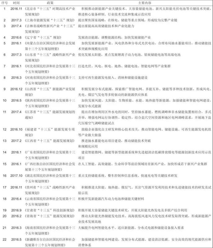 地方政府根據(jù)中央政府的政策文件精神,并結(jié)合地區(qū)經(jīng)濟(jì)基礎(chǔ)和產(chǎn)業(yè)特點(diǎn)制定相應(yīng)扶持政策,為儲(chǔ)能產(chǎn)業(yè)的發(fā)展提供了良好的政策保障,同時(shí)也優(yōu)化了儲(chǔ)能產(chǎn)業(yè)發(fā)展環(huán)境,在未來(lái)必將有效促進(jìn)儲(chǔ)能產(chǎn)業(yè)大發(fā)展。據(jù)統(tǒng)計(jì),全國(guó)各地區(qū)共31個(gè)省份、地區(qū)發(fā)布了“十三五”時(shí)期能源發(fā)展規(guī)劃政策,匯總?cè)绫?所示,其中有22個(gè)地區(qū)的規(guī)劃提到了儲(chǔ)能的發(fā)展,在這些政策的推動(dòng)下,步入“十三五”后,建設(shè)了一批儲(chǔ)能、智能微網(wǎng)等新型能源技術(shù)應(yīng)用示范項(xiàng)目,電化學(xué)儲(chǔ)能技術(shù)作為儲(chǔ)能產(chǎn)業(yè)的潛力股率先進(jìn)入發(fā)展快車(chē)道,電化學(xué)裝機(jī)規(guī)模迅速增長(zhǎng),儲(chǔ)能產(chǎn)業(yè)逐步由示范應(yīng)用轉(zhuǎn)向商業(yè)化的過(guò)渡期。其中隨著鋰離子電池制造成本的降低,鋰離子電池在儲(chǔ)能領(lǐng)域迎來(lái)爆發(fā)式增長(zhǎng)。表明隨著國(guó)家儲(chǔ)能政策和市場(chǎng)環(huán)境的變化,我國(guó)儲(chǔ)能的發(fā)展進(jìn)入了一個(gè)有序發(fā)展的戰(zhàn)略布局新階段。