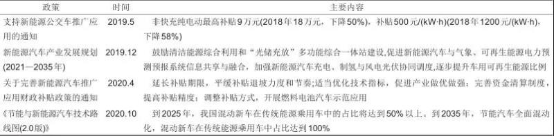 四是新能源汽車(chē)類(lèi)政策。新能源與電動(dòng)汽車(chē)行業(yè)均為我國(guó)戰(zhàn)略性新興產(chǎn)業(yè),現(xiàn)階段國(guó)內(nèi)汽車(chē)市場(chǎng)乃至全球汽車(chē)市場(chǎng)的發(fā)展重點(diǎn)都在新能源汽車(chē)領(lǐng)域,發(fā)揮新能源汽車(chē)作為移動(dòng)式靈活儲(chǔ)能的調(diào)節(jié)資源,通過(guò)合理的價(jià)格機(jī)制引導(dǎo)電動(dòng)汽車(chē)參與需求側(cè)響應(yīng),在新能源大發(fā)時(shí)段有序發(fā)電,在負(fù)荷用電高峰放電,能有效提升電力系統(tǒng)靈活調(diào)節(jié)和運(yùn)行能力[17]。中國(guó)作為全球領(lǐng)先的新能源汽車(chē)發(fā)展地區(qū),國(guó)內(nèi)市場(chǎng)對(duì)以電動(dòng)車(chē)為主的新能源車(chē)型提供了極佳的發(fā)展環(huán)境。近年來(lái)新能源汽車(chē)類(lèi)主要政策匯總?cè)绫?所示。