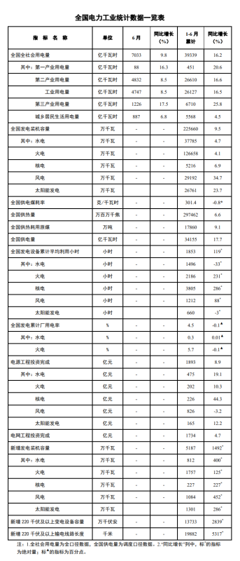 7月16日,國家能源局發(fā)布1-6月份全國電力工業(yè)統(tǒng)計數(shù)據(jù)。截至6月底,全國發(fā)電裝機容量約為22.6億千瓦,同比增長9.5%。其中,風電裝機容量約為2.9億千瓦,同比增長34.7%。太陽能發(fā)電裝機容量約為2.7億千瓦,同比增長23.7%。