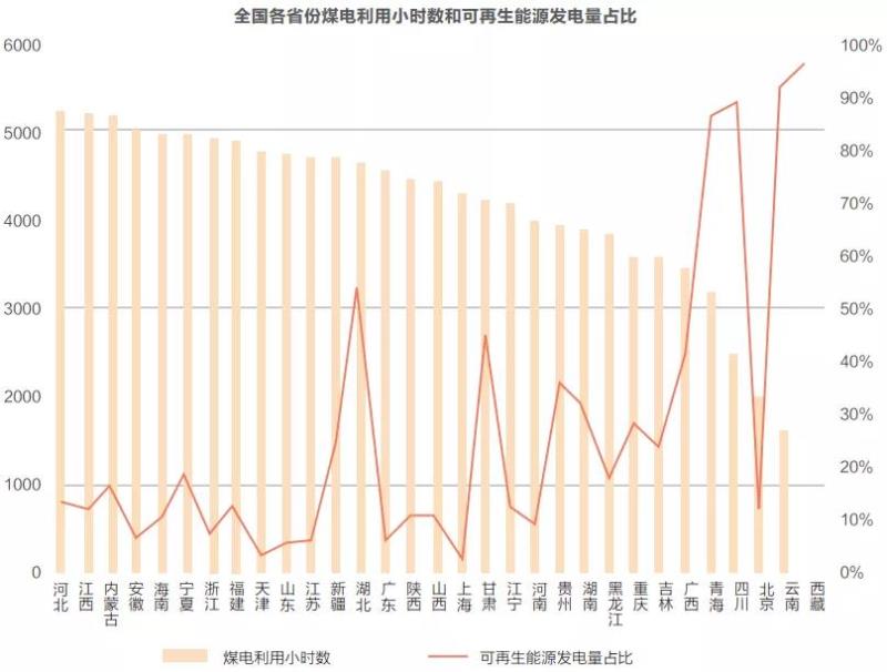 盡管煤電仍然還有4000多小時的利用小時數(shù),情形尚可,但是,從長期來看,煤電終將面臨利用小時數(shù)逐漸降低的壓力。從地區(qū)結(jié)構(gòu)上看,即便是在當前,在一些清潔能源占比較高的地區(qū),煤電的利用小時數(shù)已經(jīng)低于3000小時。從分省來看,十余個省的煤電利用小時數(shù)已低于4000小時,在清潔能源占比較高的省份,煤電利用小時已經(jīng)低于3000小時。