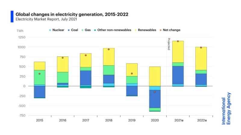 國際能源署最新發(fā)布的電力市場報(bào)告預(yù)測,全球電力需求在2020年下降約1%后,隨著全球經(jīng)濟(jì)從Covid-19大流行的影響中復(fù)蘇,2021年和2022年全球電力需求將分別增長近5%和4%。
