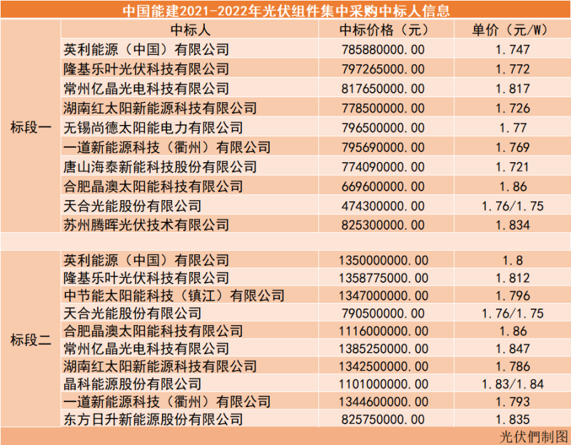 根據(jù)此前中國能建1.2GW組件集采開標(biāo)信息來看,共有24家企業(yè)參與投標(biāo),其中單玻組件投標(biāo)單價在1.721~2.011元/W,投標(biāo)均價1.819元/W。最高價格突破2元,由某一線企業(yè)投出。而此次中標(biāo)企業(yè)的單價在1.721~1.860之間。其中,標(biāo)段一、二的最高價1.86元都是合肥晶澳太陽能科技有限公司報出;標(biāo)段一的最低1.721元是由唐山海泰新能科技股份有限公司報出,二標(biāo)段的最低價1.76/1.75元由天合光能股份有限公司報出。而最高價和最低價相差約0.14元。