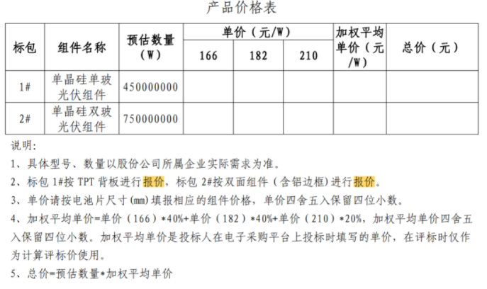 此外,組件中標(biāo)公告顯示,標(biāo)段一和標(biāo)段二各有10名中標(biāo)人,需要說明的是,此次組件報價標(biāo)段一需要以TPT背板報價,標(biāo)段二報價包含鋁邊框。根據(jù)報價方式,本次招標(biāo)采用加權(quán)平均價的形式進行投標(biāo),故開標(biāo)價格僅以加權(quán)平均價為準(zhǔn)。以下是組件具體中標(biāo)人信息以及單價。