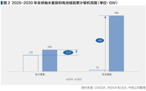 電池儲能將成為儲能新增裝機(jī)的重要來源和未來儲能的主要裝機(jī)支撐。截至2020年底,全球儲能已投運項目累計裝機(jī)規(guī)模為191GW,其中抽水蓄能裝機(jī)規(guī)模為172GW,占比90%,電池儲能裝機(jī)15GW,抽水蓄能占據(jù)絕對主導(dǎo)地位。根據(jù)IRENA和IEA預(yù)測的抽水蓄能和電池儲能裝機(jī)情況,到2030年,抽水蓄能裝機(jī)增加至230GW,2020~2030年復(fù)合增長率約3%,電池儲能裝機(jī)增加至590GW,2020~2030年復(fù)合增長率約44%。據(jù)此推算,到2030年,抽水蓄能裝機(jī)與電池儲能裝機(jī)比例約為1:2.5,電池儲能占比超過70%,成為未來儲能重要支撐性裝機(jī)來源。