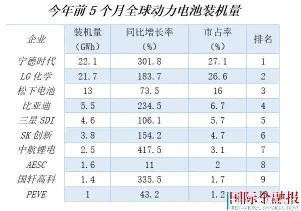 據(jù)SNE Research數(shù)據(jù),今年前5個(gè)月,全球電動汽車電池使用量同比增長約2.7倍至81.6GWh。其中,寧德時(shí)代裝機(jī)量為22.1GWh,同比增長301.8%,市場占有率27.1%,位列第一;LG化學(xué)裝機(jī)量為21.7GWh,同比增長183.7%,市場占有率26.6%,僅以0.4GWh的差距敗北。