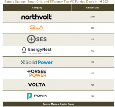 中國儲能網(wǎng)訊:據(jù)外媒報道,根據(jù)調(diào)研機構(gòu)Mercom Capital公司最近發(fā)布的一份關(guān)于電池儲能系統(tǒng)、智能電網(wǎng)、能源效率領(lǐng)域廠商的融資和并購(M&A)活動的調(diào)查報告,電池儲能行業(yè)廠商在2021年上半年籌集了96億美元資金,歐洲電池制造初創(chuàng)廠商Northvolt公司再次成為獲得風(fēng)險投資(VC)最多的廠商。