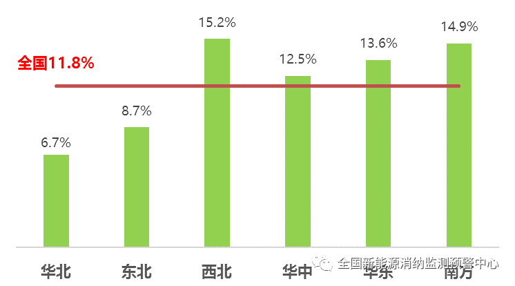 由于去年四季度風(fēng)電新增裝機規(guī)模較大,東北地區(qū)二季度合計棄風(fēng)電量6.4億千瓦時,平均棄風(fēng)率同比上升1.2個百分點至2.4%,基本無棄光,新能源消納利用保持較好水平。