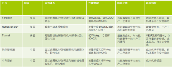 中國(guó)鈉創(chuàng)新能源:層狀金屬氧化物/硬碳有機(jī)電解液體系,軟包電池;能量密度120Wh/kg,循環(huán)超過(guò)1000次;與現(xiàn)有鋰離子電池生產(chǎn)工藝兼容;成本優(yōu)勢(shì)不明顯,有機(jī)體系存在安全隱患。