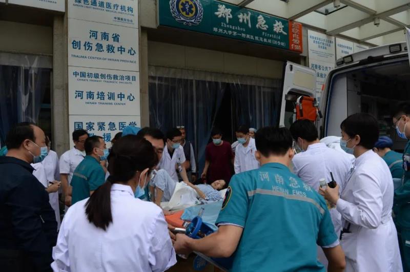 7月21日,鄭大一附院河醫(yī)院區(qū),醫(yī)護人員幫助轉(zhuǎn)移重癥患者。(新華社供圖)