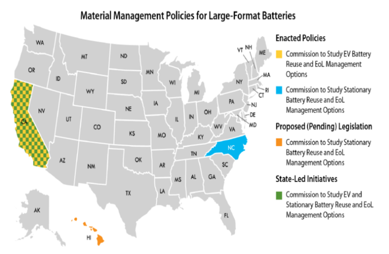 本節(jié)概述了針對電池儲能系統(tǒng)和電動汽車大容量鋰離子電池的再利用/回收和處置的擬議美國聯(lián)幫立法。截至2021年1月,調(diào)查發(fā)現(xiàn)美國聯(lián)邦立法草案中沒有明確提及這些電池的再利用、回收或處置。然而,夏威夷州立法機關(guān)提出的一項法案解決了包括電池在內(nèi)的清潔能源材料的再利用和報廢管理問題。此外,亞利桑那州在2020年立法會議上提出了一項法案(該法案未獲通過),該法案將設(shè)立一個回收基金,要求在該州銷售或租賃電動汽車電池的任何人員收取費用,要求將電動汽車電池送至州批準的回收設(shè)施,而且本應(yīng)禁止在固體廢物填埋場進行處置。盡管亞利桑那州法案未能通過,但它提供了另一個監(jiān)管框架的例子,可用于實現(xiàn)大容量鋰離子電池的再利用和再循環(huán)。