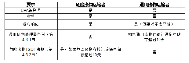 表7比較了美國聯(lián)邦政府對危險廢物和通用廢物運輸者的要求。