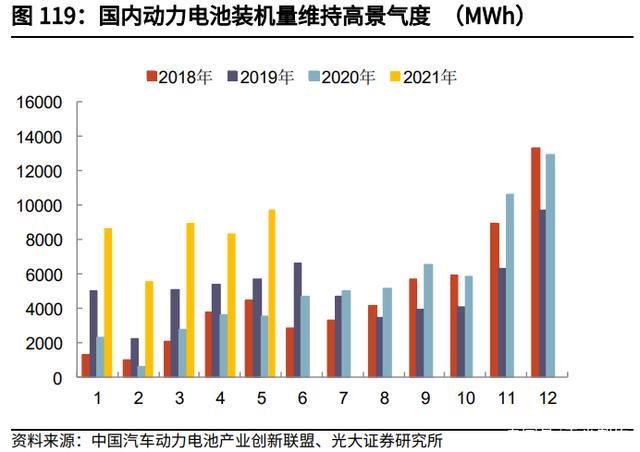 新能源汽車需求旺盛帶動(dòng)了動(dòng)力電池產(chǎn)業(yè)鏈公司的產(chǎn)量增長,2021 上半年鋰電 產(chǎn)業(yè)鏈公司均處于滿產(chǎn)狀態(tài),部分環(huán)節(jié)例如電解液、六氟磷酸鋰等甚至出現(xiàn)了產(chǎn) 能緊張、供不應(yīng)求的情況。正極、負(fù)極、隔膜、電解液企業(yè)月度產(chǎn)量環(huán)比不斷增 長。