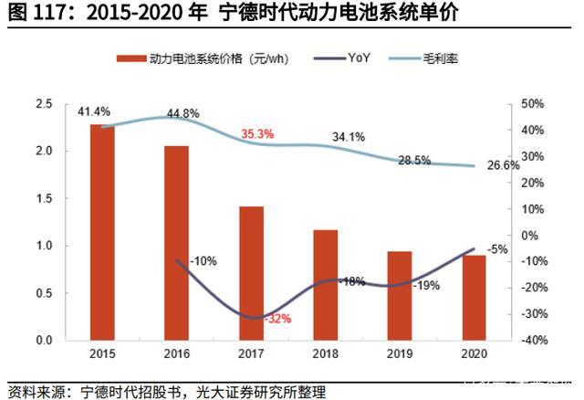 動(dòng)力電池企業(yè)具有較強(qiáng)成本消化能力。以寧德時(shí)代為例,2017 年動(dòng)力電池系統(tǒng) 價(jià)格為 1.41 元/Wh,同比下降 32%,2014-2017 年年均復(fù)合降幅為 21.3%。2017 年,由于受到下游補(bǔ)貼退坡和上游漲價(jià)的雙重壓力,電池系統(tǒng)平均價(jià)格同比下降 32%,而毛利率僅下降 9.5pcts,電池價(jià)格降幅大于毛利率降幅。未來動(dòng)力電池降本趨緩,且下游市場化轉(zhuǎn)變不再依賴補(bǔ)貼,動(dòng)力電池企業(yè)面臨的成本壓力僅來 自于上游漲價(jià),盈利壓力相對較輕。