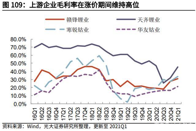 盈利情況與價(jià)格走勢基本一致。分環(huán)節(jié)來看,上游資源、正極材料、電解液這些 價(jià)格波動(dòng)較大的環(huán)節(jié),毛利率走勢基本與價(jià)格一致,而負(fù)極材料、隔膜價(jià)格平穩(wěn) 且逐漸降價(jià),毛利率情況穩(wěn)定。動(dòng)力電池環(huán)節(jié)由于降本的下游應(yīng)用需要,毛利率 處于穩(wěn)步下降的趨勢。