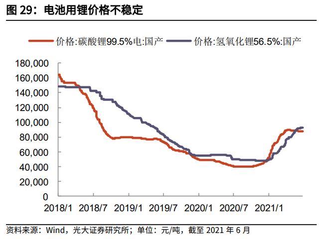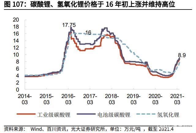 (1)根據(jù)鋰鹽的歷史價(jià)格,可以看出中國鋰鹽在 2015 年之前處于供需平衡狀 態(tài),碳酸鋰和氫氧化鋰的價(jià)格主要在 4 萬元/噸上下波動(dòng),整體變化不大。2015 年起,隨著中國新能源汽車的快速發(fā)展,國內(nèi)鋰鹽市場供小于求,鋰鹽價(jià)格大幅 快速上漲。2016 年電池級碳酸鋰的價(jià)格漲至近 18 萬元/噸。