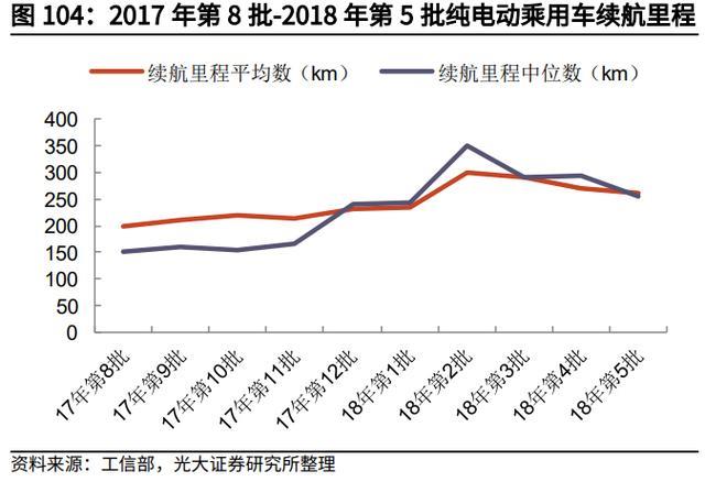 我們梳理了新能源汽車推薦目錄(2017 年第 8 批-2018 年第 5 批),新發(fā)布車 型和變更擴(kuò)展車型中,純電動(dòng)乘用車?yán)m(xù)航里程的均值和中位數(shù)總體表現(xiàn)出提升趨 勢,2017 年第 8 批-2018 年第 5 批,均值由 199km 提升至 277km,中位數(shù)由 155km 提升至 270km;純電動(dòng)乘用車電池系統(tǒng)能量密度也表現(xiàn)出增長趨勢,均 值由 123Wh/kg 提升至 133Wh/kg,中位數(shù)由 126Wh/kg 提升至 135Wh/kg。