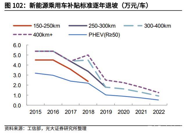1、補(bǔ)貼退坡:續(xù)駛里程不足 300 公里的純電動(dòng)乘用車補(bǔ)貼減少 1~2.1 萬元;插 電混動(dòng)乘用車補(bǔ)貼減少 0.2 萬元;純電動(dòng)客車補(bǔ)貼減少 3~12 萬元;插電混動(dòng)客 車補(bǔ)貼減少 3~12 萬元;專用車補(bǔ)貼上限減少 5 萬元;燃料電池汽車補(bǔ)貼不變。