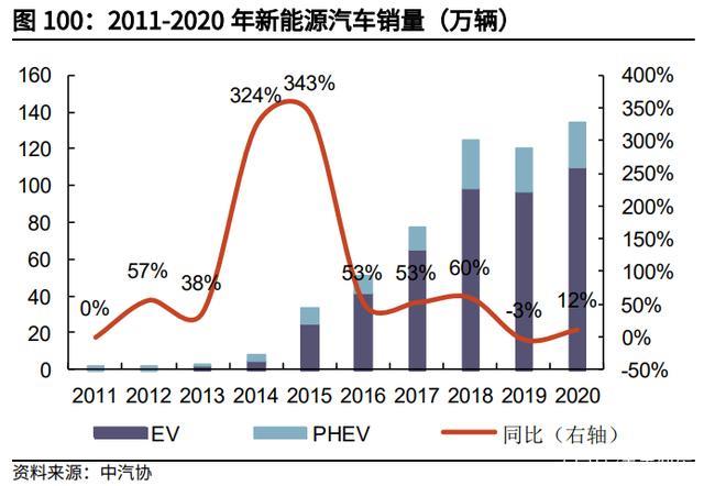 得益于我國強(qiáng)大的抗疫組織能力,2020 年我國新能源汽車銷量態(tài)勢良好,四月 起銷量便企穩(wěn)并不斷回升。根據(jù)中汽協(xié)數(shù)據(jù),2020 年我國新能源車銷量 136.7 萬輛,同比增長 10.9%。其中,純電動(dòng)汽車銷量為 109.4 萬輛,同比增 11.6%; 插電式混合動(dòng)力汽車銷量為 24.9 萬輛,同比增長 8.4%,電動(dòng)車滲透率從 2019 年的 4.7%提升至 2020 年的 5.4%。
