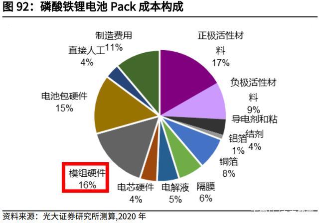 動(dòng)力電池 Pack 主要由電芯、模組硬件、電池包硬件構(gòu)成。據(jù)我們的動(dòng)力電池 Pack 成本構(gòu)成模型可見,電芯硬件在成本構(gòu)成中占比約不到 5%,模組硬件占 比約 13-16%,因此可以通過整合精裝電芯、模組硬件來達(dá)到降低成本的目的。